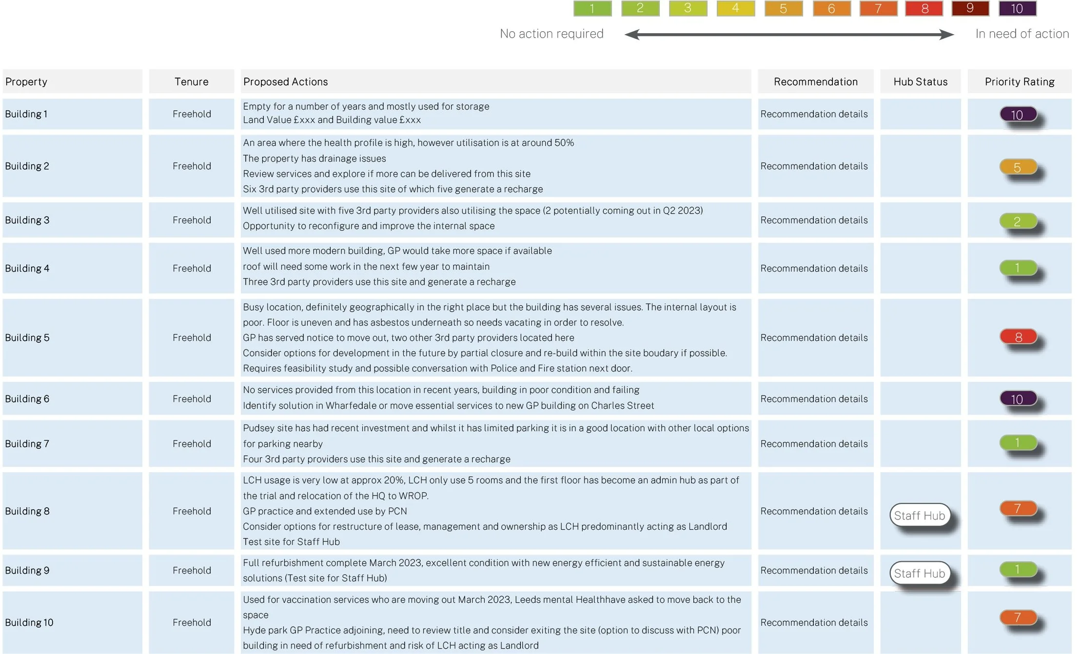 The principle being, to make it as easy as possible for Senior Management Teams and Service Leaders to access the information and consider future options about re-negotiating leases, exiting and divesting of sites, investing in sites, relocating services and looking at the real use of space.